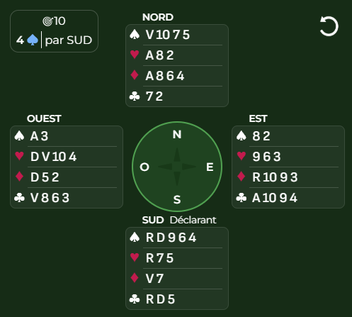 Pour commencer : Jouons 2 tours d’atouts, si les ♠️ sont 2-2, il nous suffira de couper le 2 de ♦️ s'ils sont mal répartis.